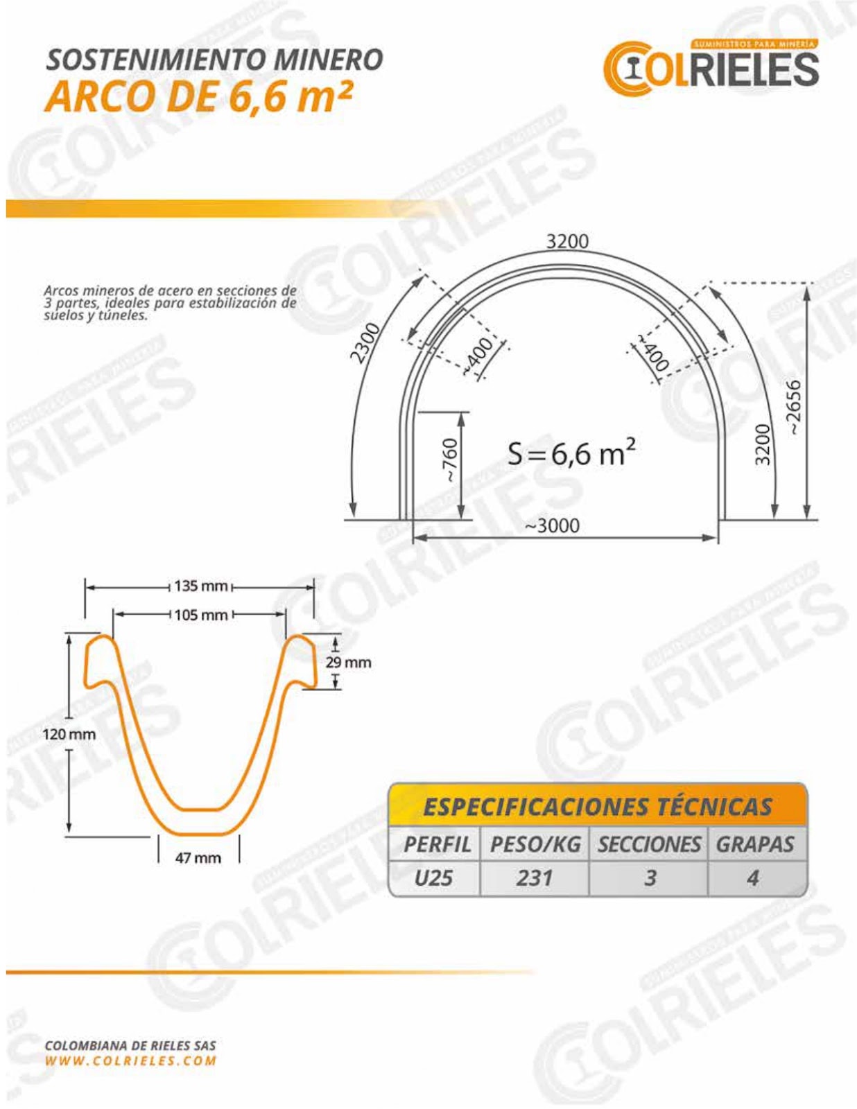 Los arcos mineros de acero son la solución más confiable para la estabilización y sostenimiento de túneles en minería y obras subterráneas. Fabricados en secciones de 3 partes, garantizan resistencia, seguridad y facilidad de instalación en condiciones exigentes. se adaptan a distintos proyectos de construcción y minería. Su diseño robusto permite soportar altos movimientos de suelo y prolongar la vida útil de la excavación, siendo un elemento esencial en el sostenimiento minero. Incluyen Grapas y tornilleria.