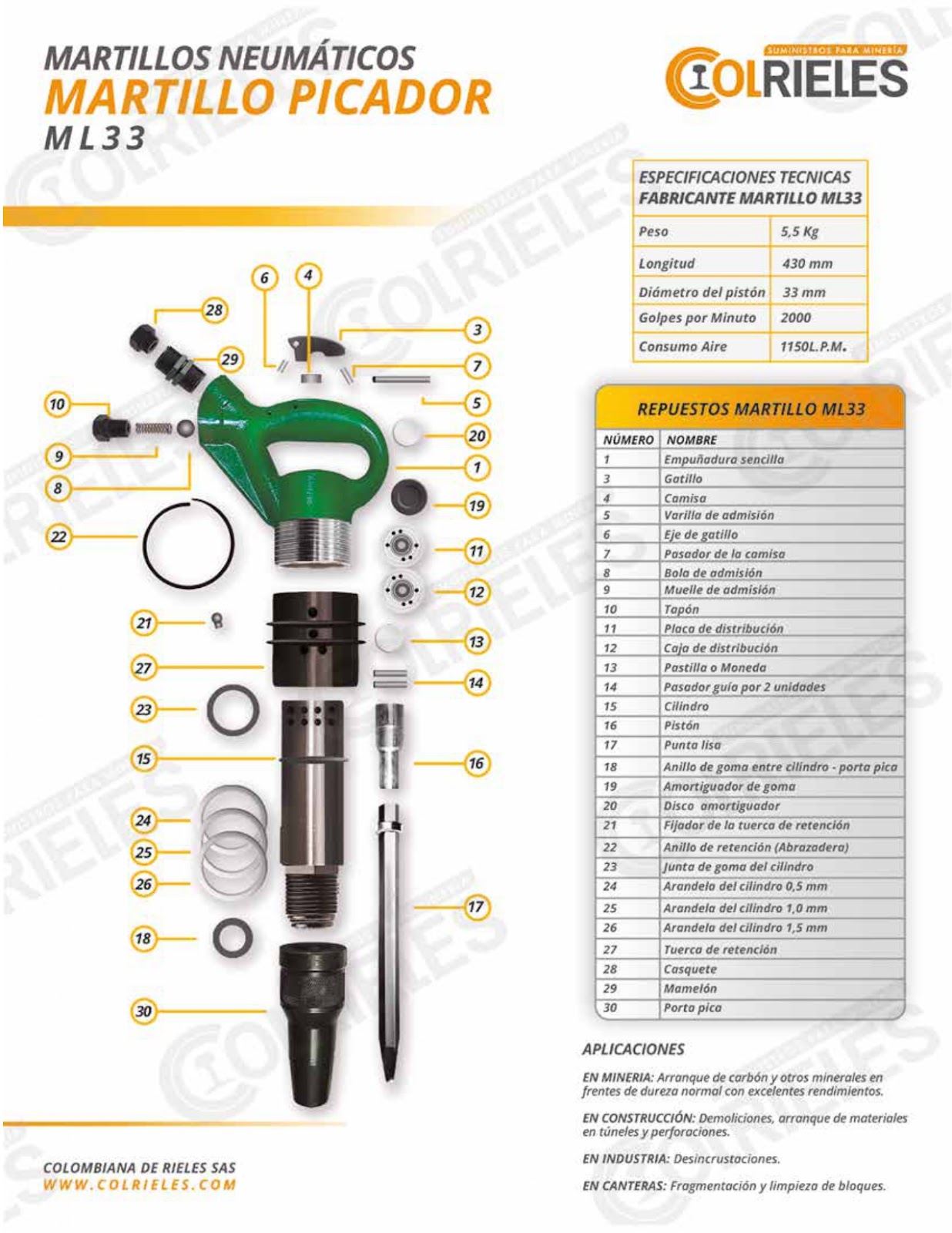 El martillo neumático ML33 de la marca La Cruz está diseñado para ofrecer potencia y eficiencia en minería, especialmente en el arranque de carbón y minerales en frentes de dureza normal. Su estructura ligera y de rápido desempeño garantiza altos rendimientos en trabajos continuos. Además, es ampliamente utilizado en la construcción para demoliciones, arranque de materiales en túneles, perforaciones, desincrustaciones, fragmentación y limpieza de canteras. Su resistencia y facilidad de operación lo convierten en una herramienta confiable y duradera para labores exigentes.