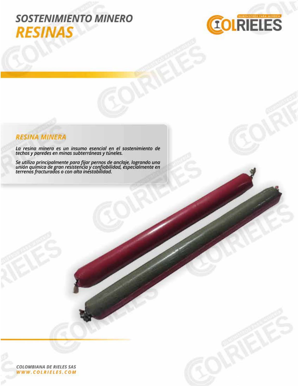 En Colombiana de Rieles ofrecemos resinas mineras certificadas, con garantía de calidad, resistencia comprobada y entrega a nivel nacional, ideales para operaciones mineras de carbón, oro, esmeraldas, así como proyectos civiles subterráneos.