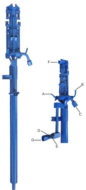 Este modelo está diseñado para trabajar con pusher leg (pata de empuje), lo que permite una perforación más rápida y estable, con diámetros de entre 27 mm a 46 mm y profundidades de hasta 6 metros. Además, su sistema de lavado con aire o agua mejora la limpieza del barreno y prolonga la vida útil de los útiles de perforación.